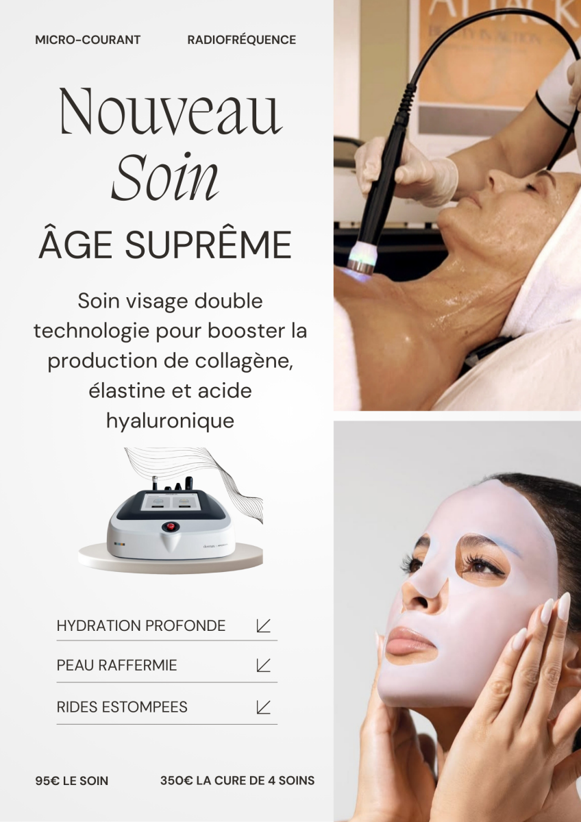 Le Soin du visage Age Suprême est un véritable soin complet du visage et du cou, alliant la double technologie du Micro-courant et de la Radiofréquence, aux produits de soin Arosha avec masque liftant de biocellulose, pour une peau raffermie, lissée et parfaitement repulpée.